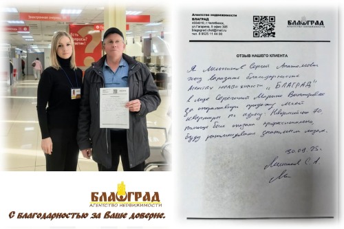 Хочу выразить благодарность агентству недвижимости Блаград, Серегину Денису В. И Ходаковой Алине Р, за помощь в продаже и покупке квартиры , по адресу Харлова 9. Было приятно с ними работать, они ответственные, компетентные, доброжелательные. Буду рекомендовать это агентство всем своим знакомым.